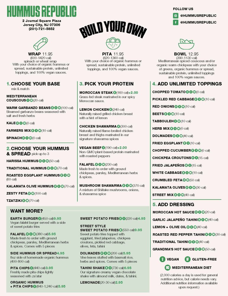 Welcome to Hummus Republic, your new go-to spot for a healthy Mediterranean dining experience in Jersey City! Located at 2 Journal Square Plaza, this Halal-certified kitchen offers a vibrant menu focused on fresh, wholesome ingredients.
